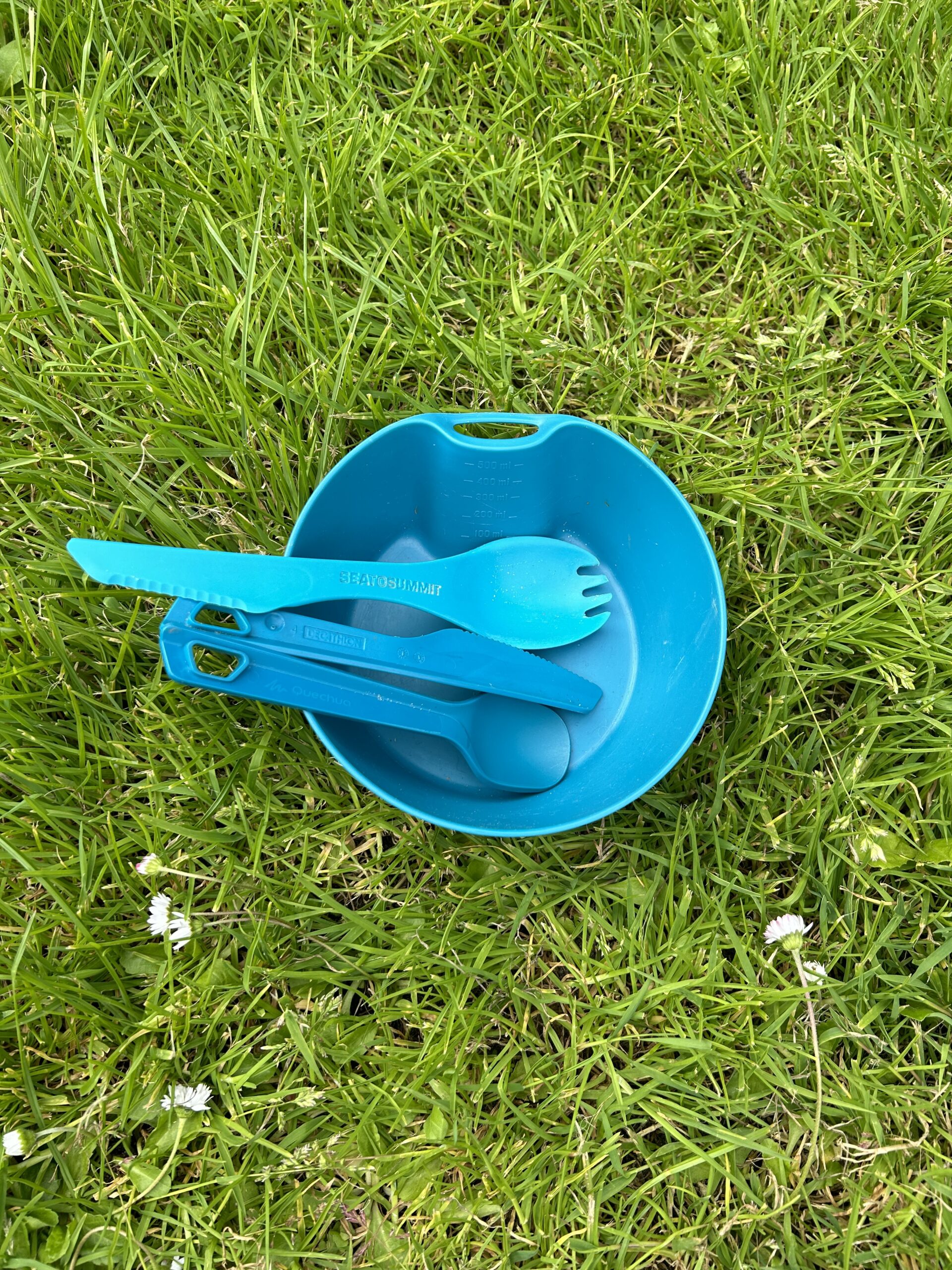 Eenpersoons set met een bakje, bestek, thermobeker en snijplank.