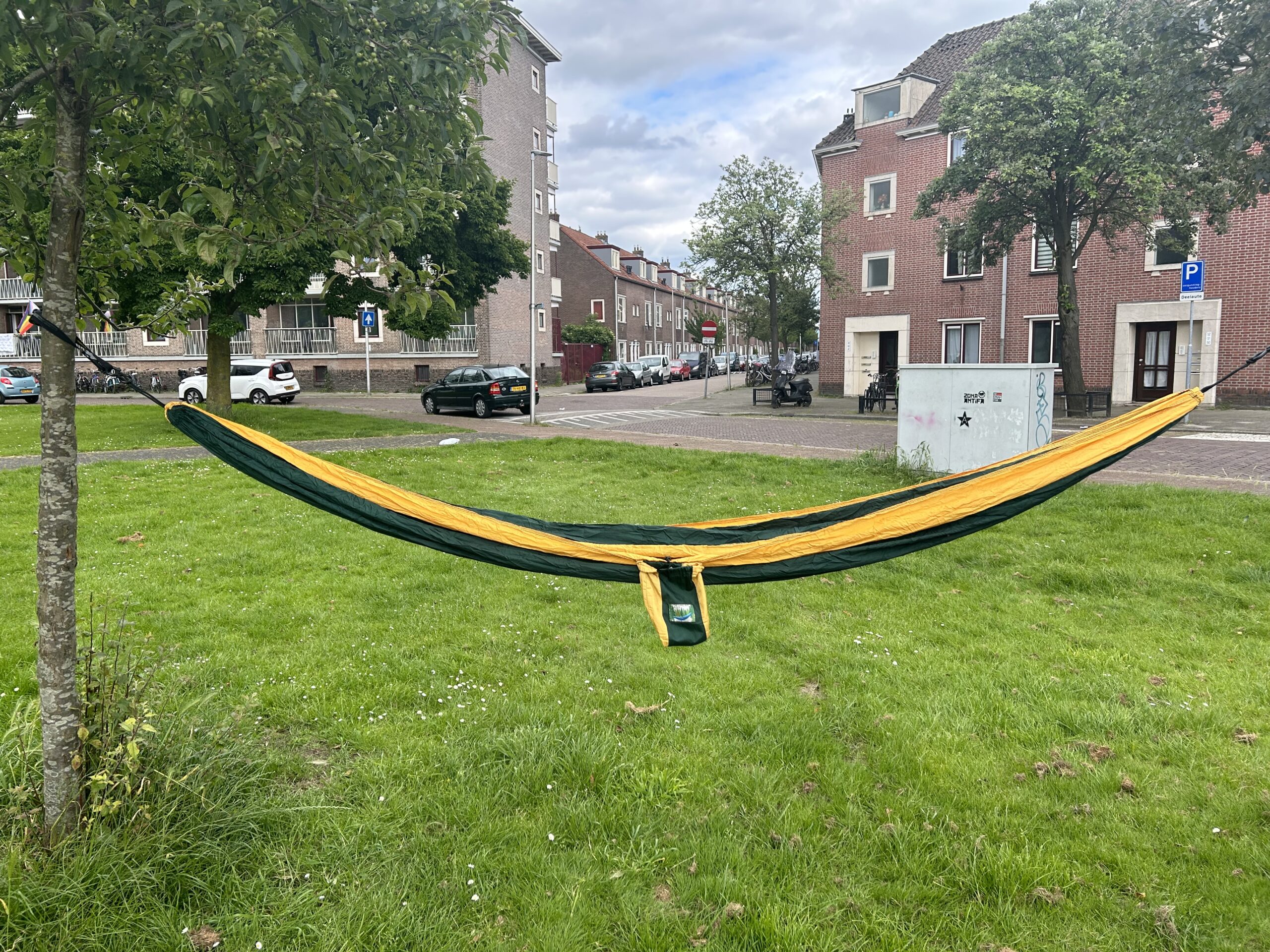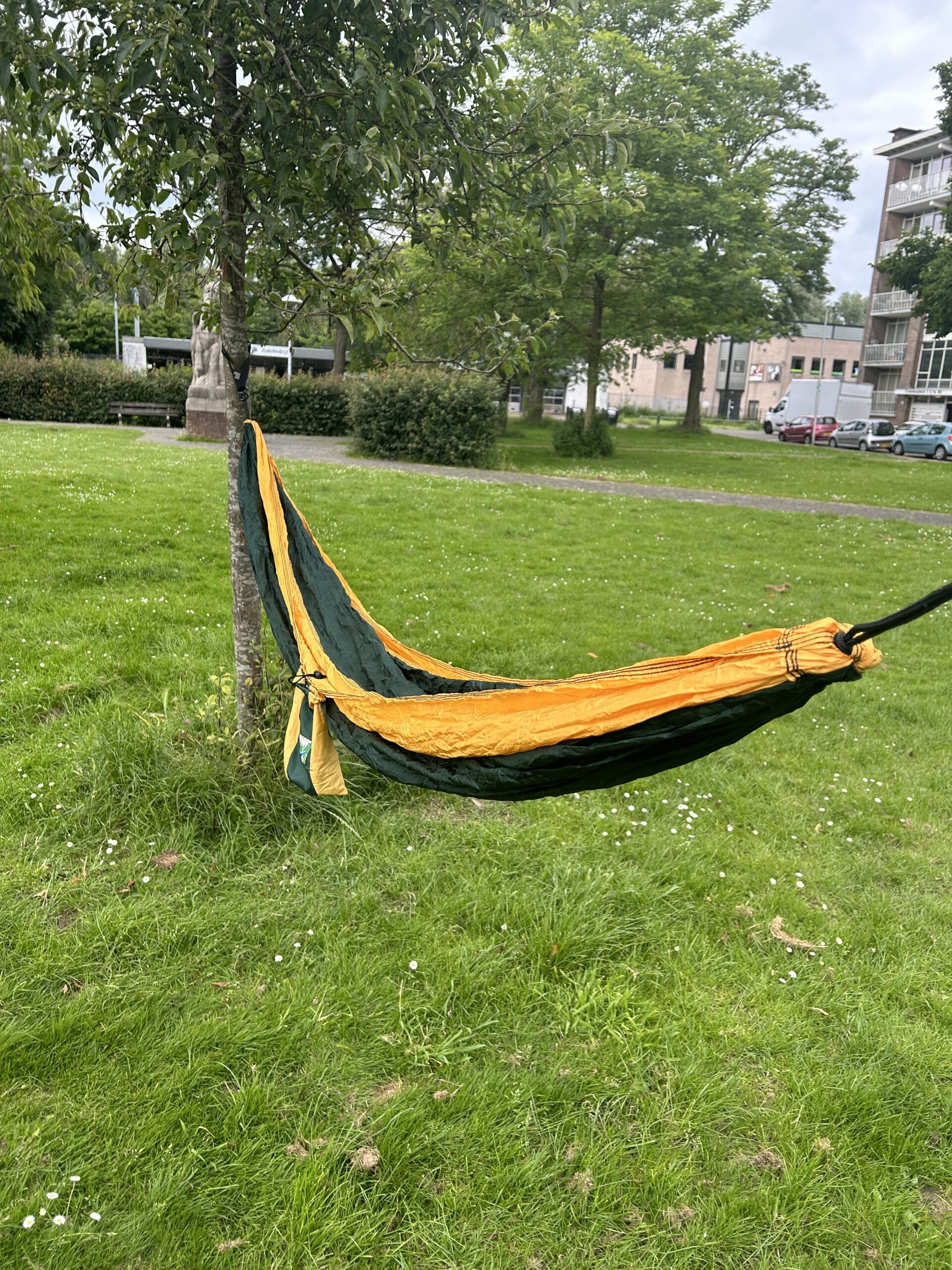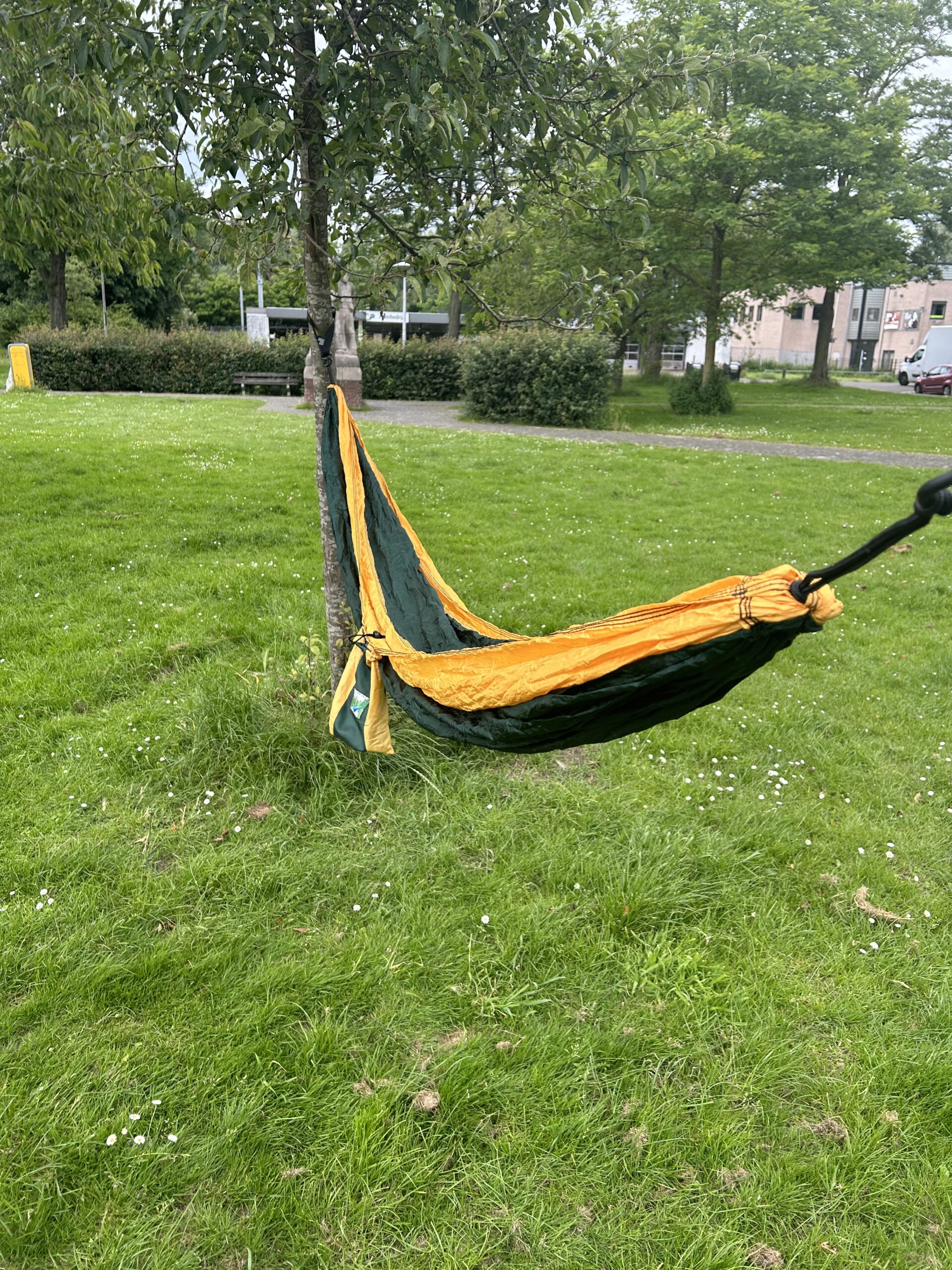 Een heerlijk grote hangmat met haken aan beide kanten. Voor het bevestigen heb 2 haken/ringen of touwtjes nodig. Compact op te bergen in het zijvakje van de hangmat.