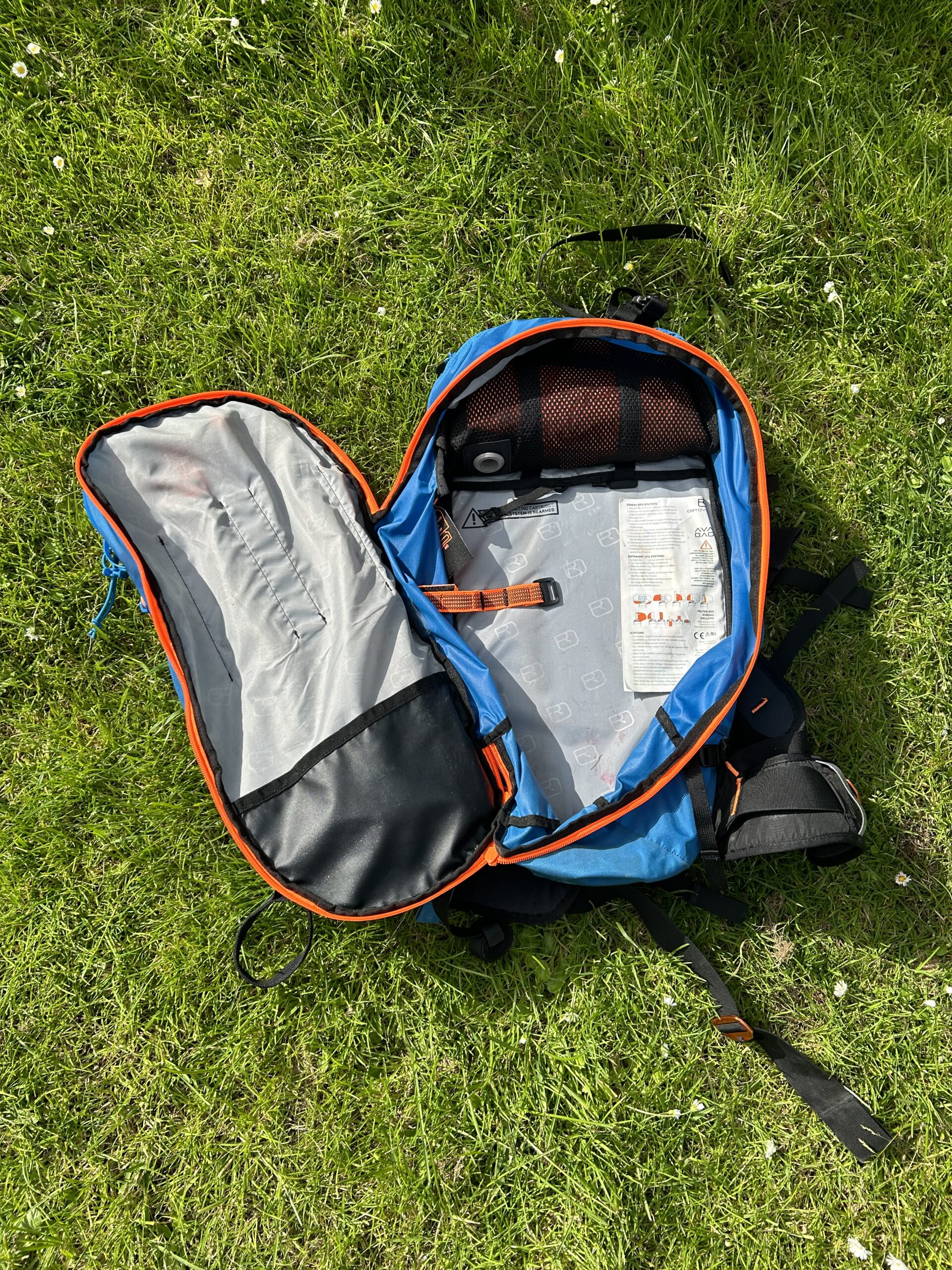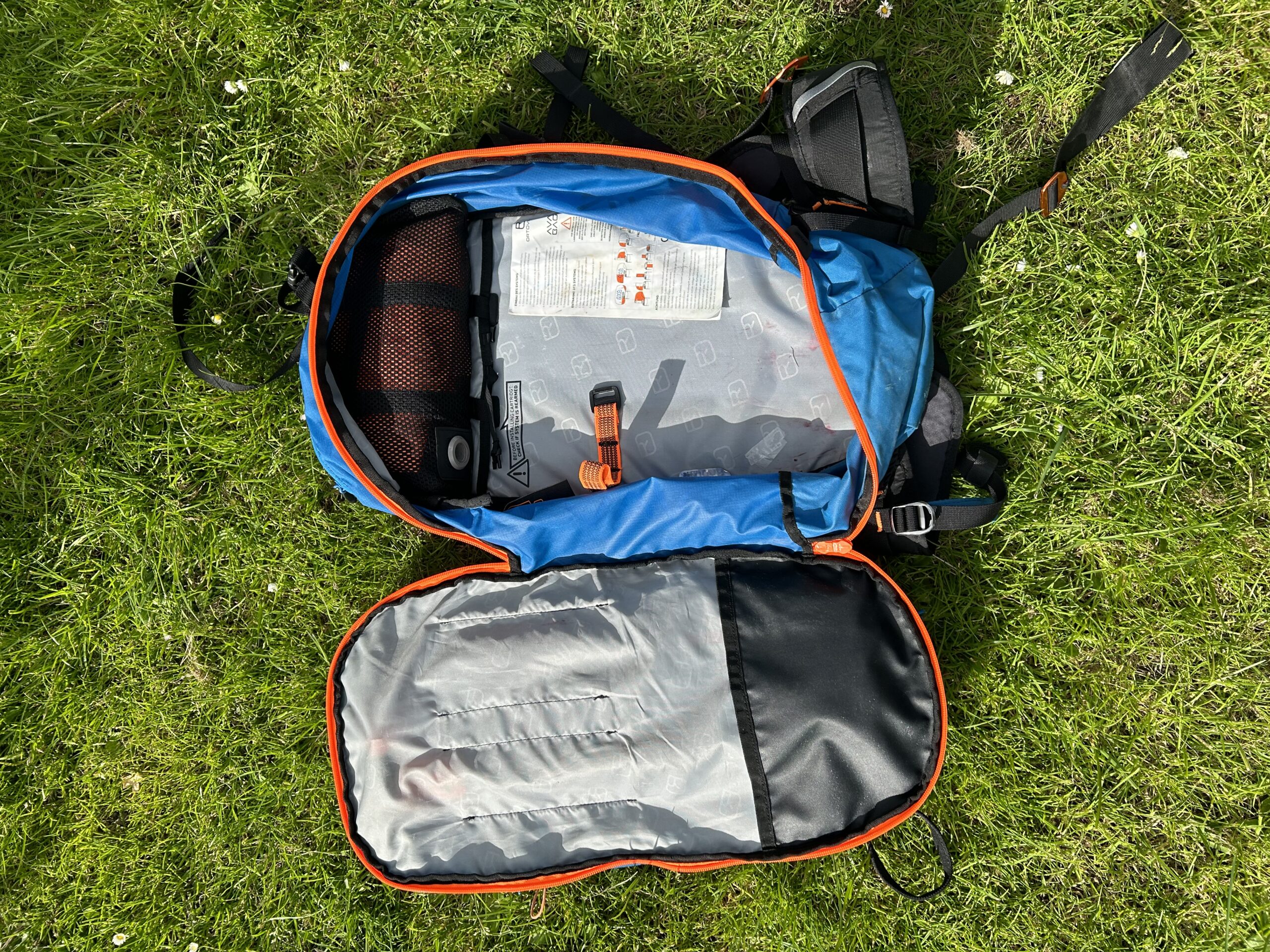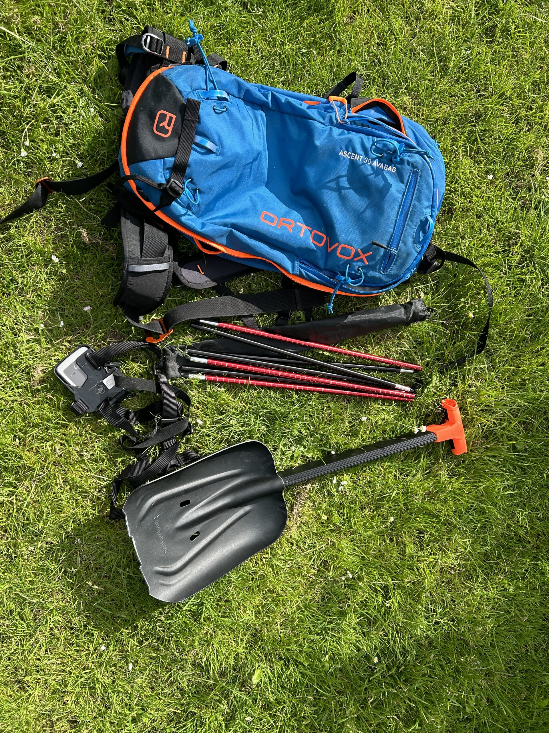 Lawine uitrusting: Mammut barryvox pieper, sonde (32o cm), schep én Ortovox Avabag (30liter).