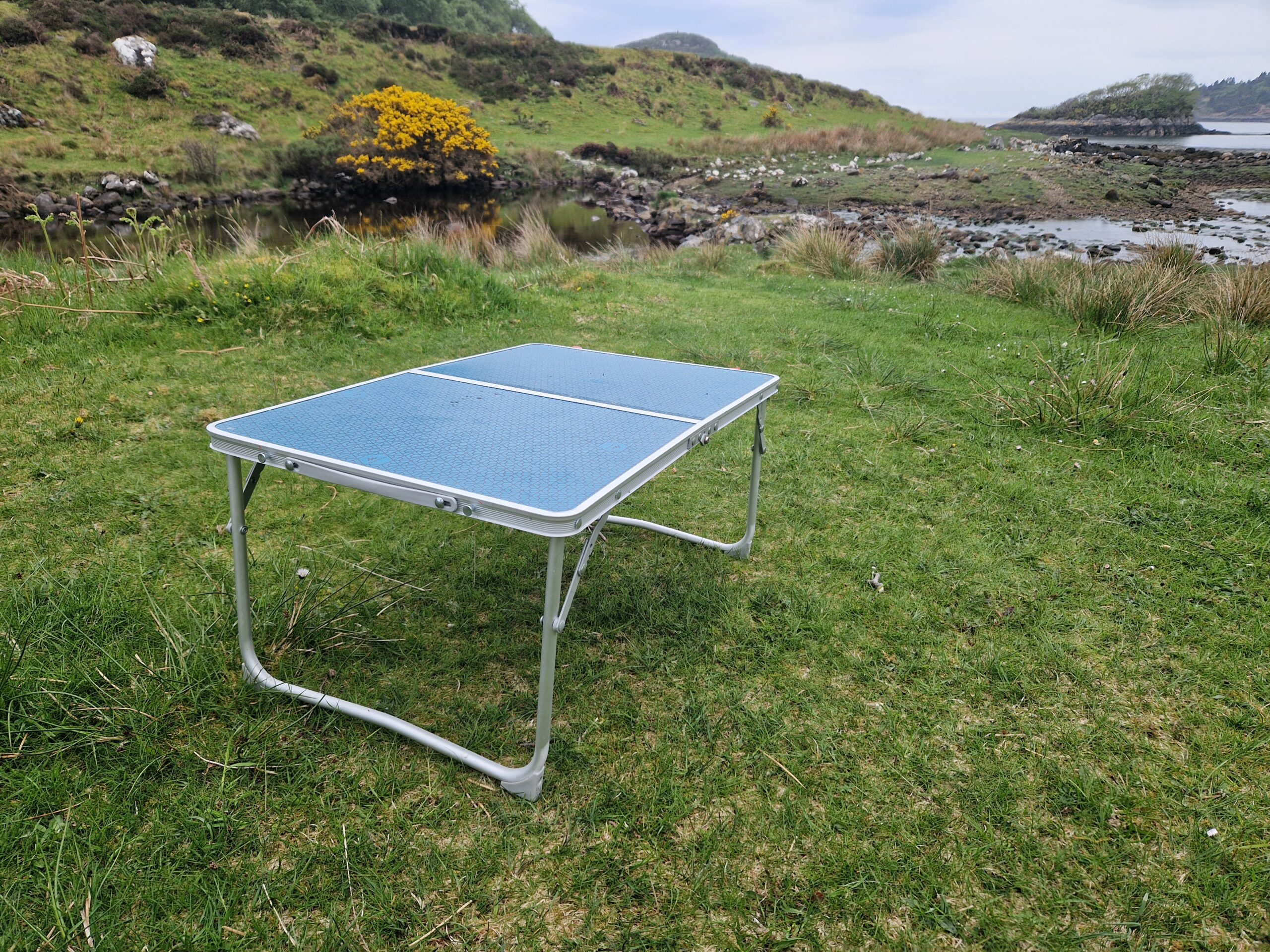 Een licht en laag kampeertafeltje, makkelijk op te klappen en te vervoeren met handvat. Handig bij lage kampeerstoelen.